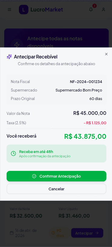 A antecipação é feita sob demanda. Você escolhe quais notas deseja antecipar, visualiza a simulação e confirma a operação diretamente na plataforma.