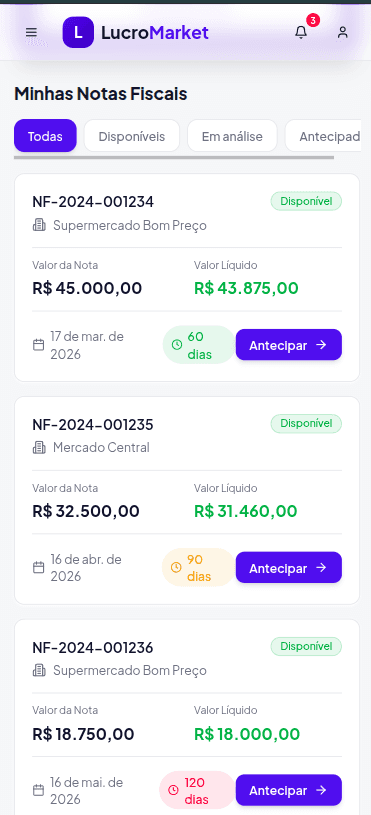Você pode solicitar a antecipação sempre que houver notas fiscais elegíveis disponíveis na plataforma, respeitando as regras e limites definidos para o seu perfil.